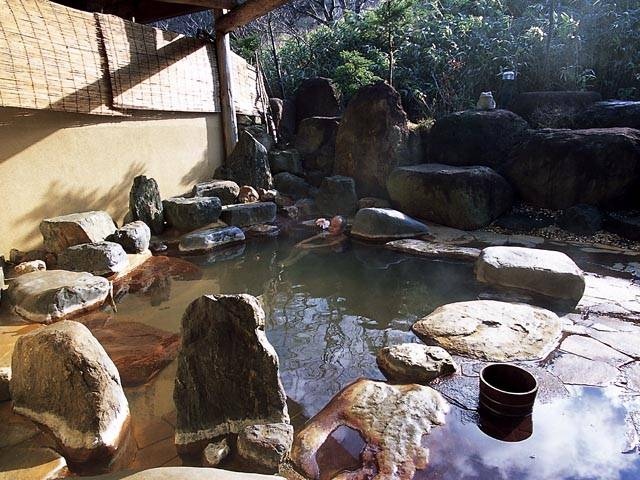 露天風呂は男女別で野趣あふれる造り。貸切で使える露天風呂もある。後方に山々が眺められる。薬湯として知られる岩風呂は胃腸病や便秘などの効能を持っている。