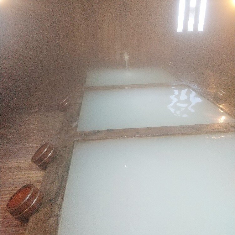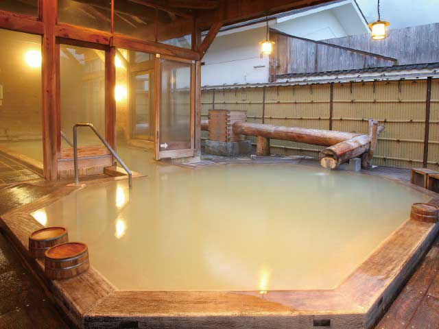男女別の大浴場「剣の湯」と「扇の湯」は大理石の浴場。そのほかに、3つにわかれた檜の浴槽がある「千寿の湯」と石造りの露天風呂「鬼面の湯」と「天狗の湯」がある。