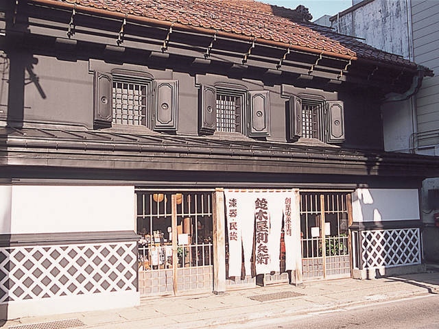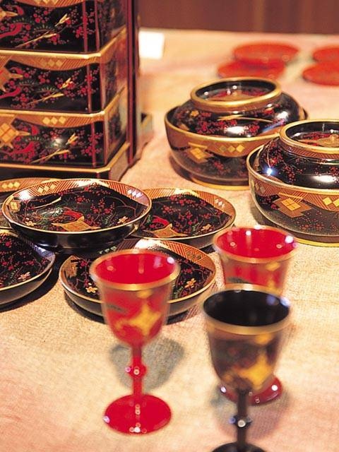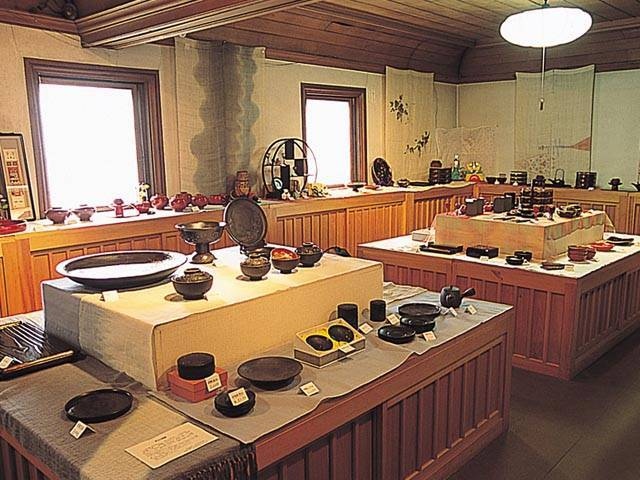 江戸時代に創業。黒漆喰が美しい蔵の中には、松竹梅や菊絵など伝統的模様「会津絵」を施した重箱やワインカップ、椀などが並ぶ。会津塗の雛人形も人気だ。民芸品も扱っている。
