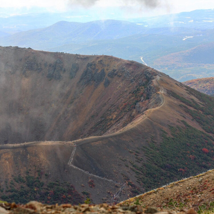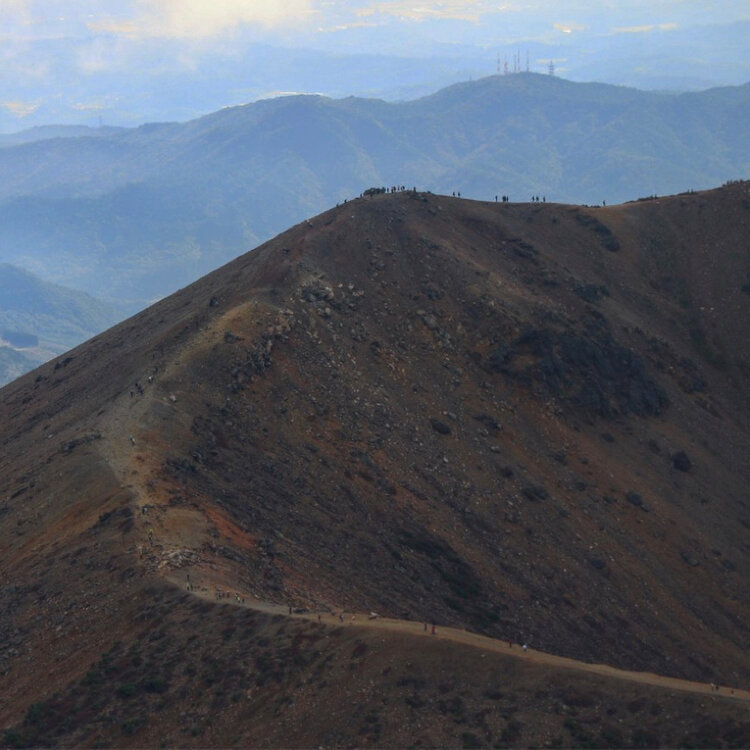 標高1707mのコニーデ型の火山で、直径約500mのすり鉢のような火口が特徴。火口の上までは登山道が整備され、およそ10分で登ることができる。火口は1周約60分。