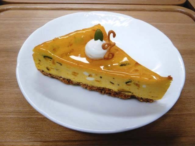 若い女性パティシエは、ケーキの素材にカボチャやホウレンソウなどといった地元産野菜をチョイス。色や風味など、野菜ごとの特性を生かしつつ、自然な甘さの一品に仕上げている。