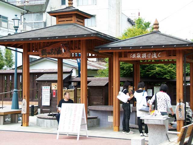 いわき湯本温泉街のシンボル的な広場。一度に15人ほどが利用できる大小2つの足湯と手湯があり、ともに源泉掛け流し。更衣処や休憩できるベンチも設置されている。