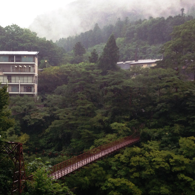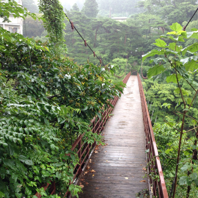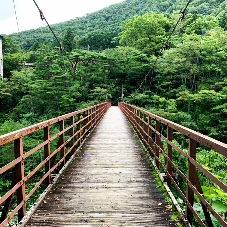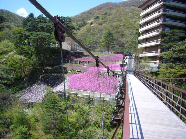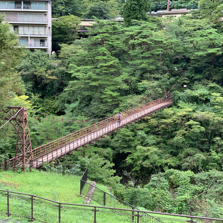 鬼怒川公園駅から温泉街に向かうと見えてくるのが滝見橋。鬼怒川温泉街にかかる橋で唯一の吊り橋。平成21年にリニューアルした。