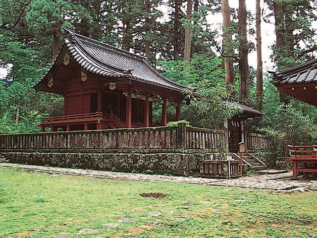 二荒山神社の別宮で、二社一寺の奥にある石畳の参道を約2kmほど歩いた場所にひっそりと立つ。楼門前には、小石が穴を通れば願いがかなうという「運試しの鳥居」がある。安産子種石も有名。