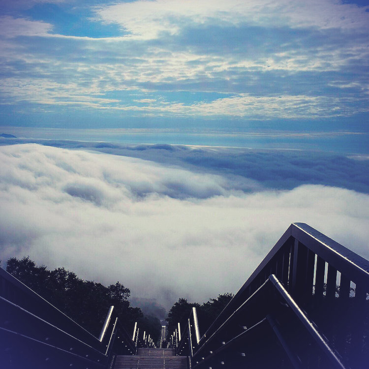 【霧降高原 ニッコウキスゲのお花②】 雨のなか、1445段の天空回廊(階段)を一段一段踏みしめながら登ります。 小鳥たちのさえずりが、とても励みになりました🕊️ 登山口付近は、本降りの雨でしたが。 階段を登るにつれ、雨も弱くなりつつありました。 そして登りきると、ニッコウキスゲの黄色のお花と背景は山々が広がる絶景が出迎えてくれました。 雨が止もうと、徐々に空が明るくなってきましたので。 霧や雲海が出てくれて、登るまで想像していなかった絶景が出迎えてくれました。 (写真1枚目) 登りきった達成感と、幻想的な景色に心が癒され、とても心地良い時間が流れていました。 写真2枚目・3枚目・・・階段を登る途中、展望台より眺めた景色です。 写真4枚目・・・階段を頂上から降りるところを写したものです。 こう見ると、爽やかな景色と改めて感じます。 写真5枚目・・・階段突破記念に頂いた記念スタンプ(ポストカード)です。 頂上のキスゲ平に、合言葉が隠されていて、下山後に、その合言葉を管理事務所の方に伝えると。 記念のポストカードとスタンプが頂けます!! きっと晴れた日でしたら、青空の下、青い空に黄色のニッコウキスゲのお花が映えた景色が眺められたかと思います。 小雨が降るなかでのお花畑に雲海が見えたりと、また心に残った花景色に出会えて嬉しかったです。 #霧降高原 #天空回廊 #石階段 #絶景 #ニッコウキスゲ #雨女 #ずっと見たかった花景色 #雲海 #筋肉痛