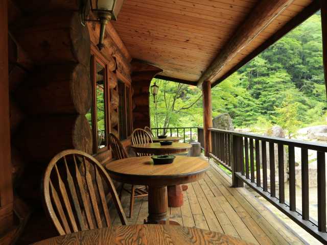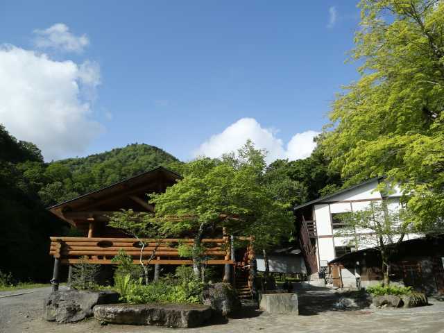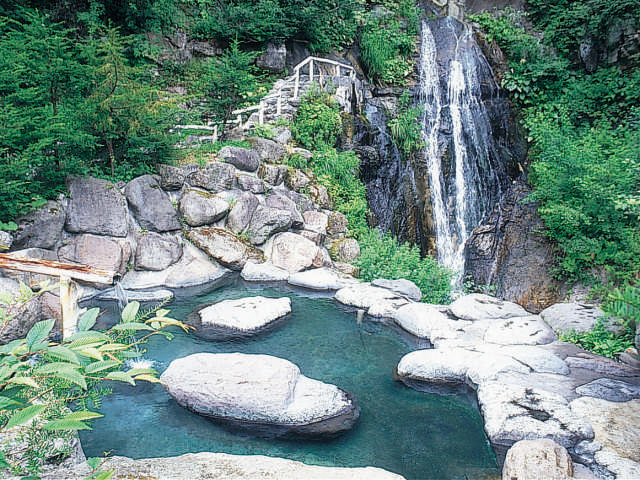 敷地内の山肌から源泉が湧出しており、豊富な湯量を生かした掛け流しの湯が趣深い。混浴露天風呂と女性専用露天風呂があり、どの風呂からも渓流に落ちる滝が一望できる。