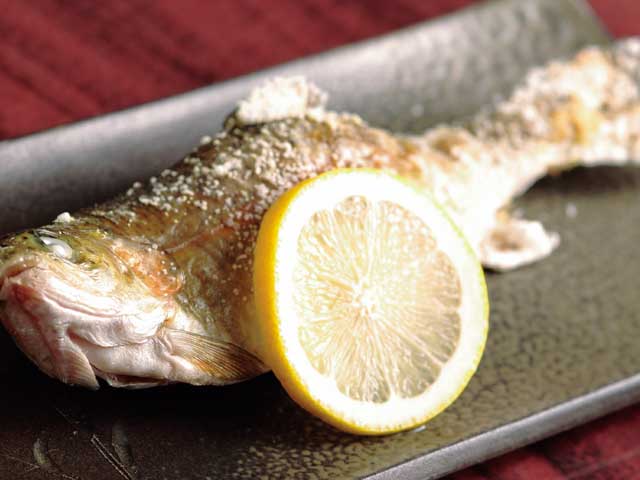 菖蒲ヶ浜に立つレストハウスで、名物はマスの塩焼き。注文を受けてから焼いているので、アツアツで身はほくほくとしている。