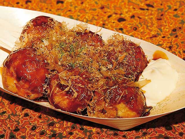 伊香保焼はカリッとした厚めの皮とトロリとした中身のオリジナルたこ焼き。石段街の沿道にあり、店内には伊香保の源泉・黄金の湯が楽しめる入浴施設「政五郎の湯」を併設。