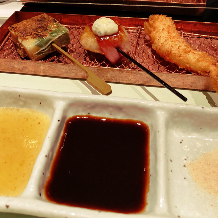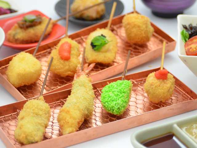 旬の素材をひと手間加え、華やかな串揚げに。油切りをしっかりしているので、口当たり軽やかでとってもヘルシー。さまざまな自家製ソースが選べるのもうれしい。