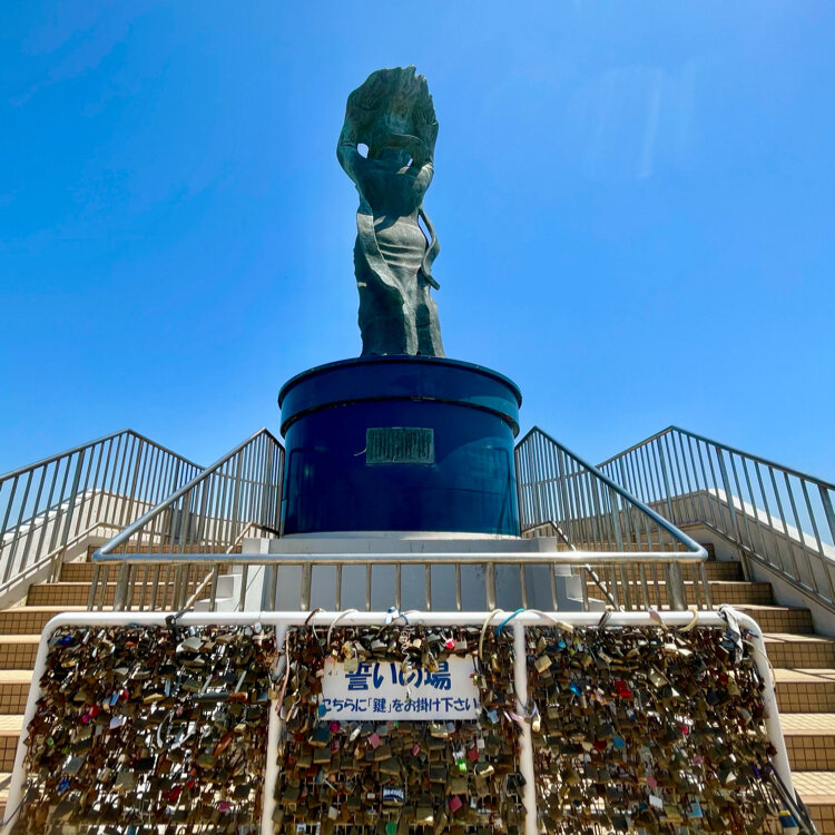 【房総半島ドライブ㉗】〜親子3人女子ドライブ🚗 この場所は、かって漁師たちが沖合に来る魚の群れを見張っていたことから、「魚見塚」と言われているそう。 確かに見晴らしは抜群だがかなりの距離があるのでここから魚の群れ🐟が見えたのか⁉️昔の人すごい...😳 . 以下説明文から 『展望台頂上に立っている像は、郷土の木彫作家長谷川氏の作品で、仏の化身(乙女)が暁の潮風を受けているところから「映風」と命名されています。 いつからか、この「風」の前で恋人同士が誓いをたて、その証として、ふたりで「鍵」🔑をかけていくと、「幸せが未来へ続く」と言われるようになりました。 そして、今では「誓いの丘」と呼はれています。」 確かに南京錠🔓がたくさん掛かってました。 . え。漁師町の魚見塚だよね❓ 何処へ行ってもこの手の『恋人たちのための場所』的なものに変化しているのを見ると、正直なんだかなぁ...😅と思ってしまうオバさんでした😓 しかし展望台としてはとても気持ちの良い場所でしたよ❣️ . 駐車場からは意外と坂道と階段が多いのでお年寄りは厳しいかも。 実際私の母は途中の公衆トイレのある場所で「ここで待ってるから行っておいで」と諦めてしまいました。 . 2025.05.05 . #房総半島 #海 #鴨川 #アートな景色 #展望台