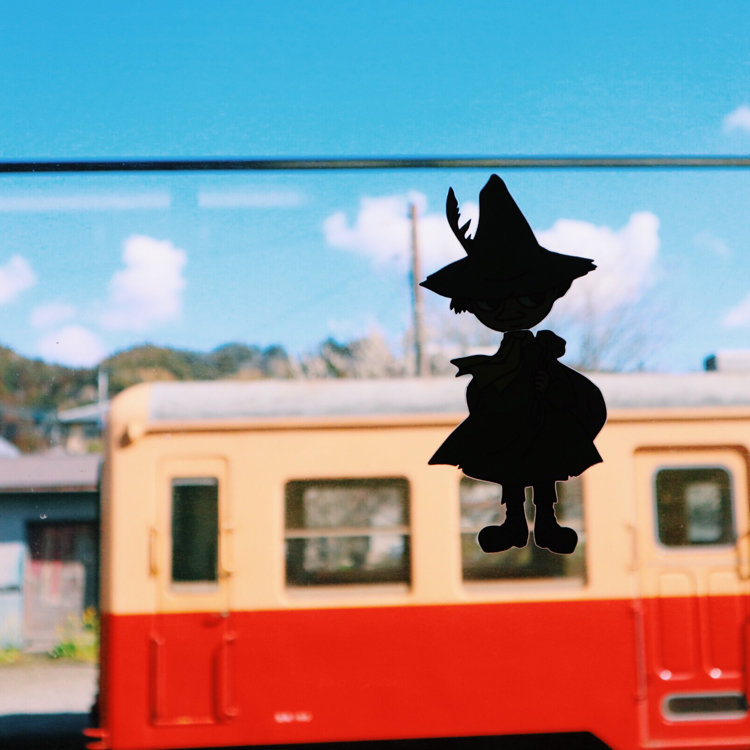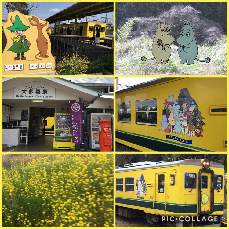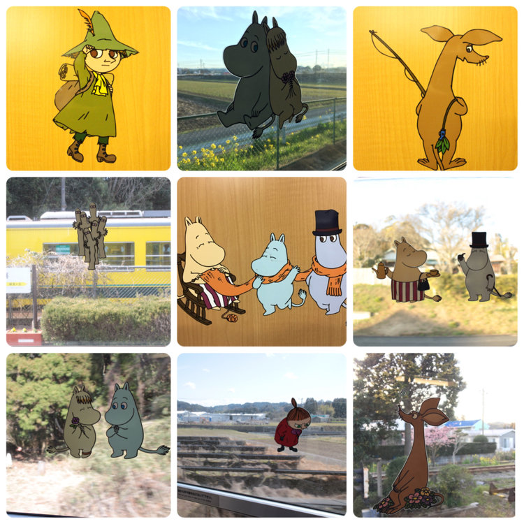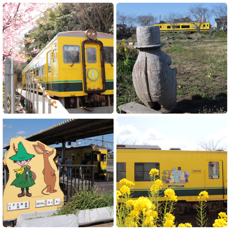 ムーミンが描かれた車両が菜の花の絨毯を駆ける
