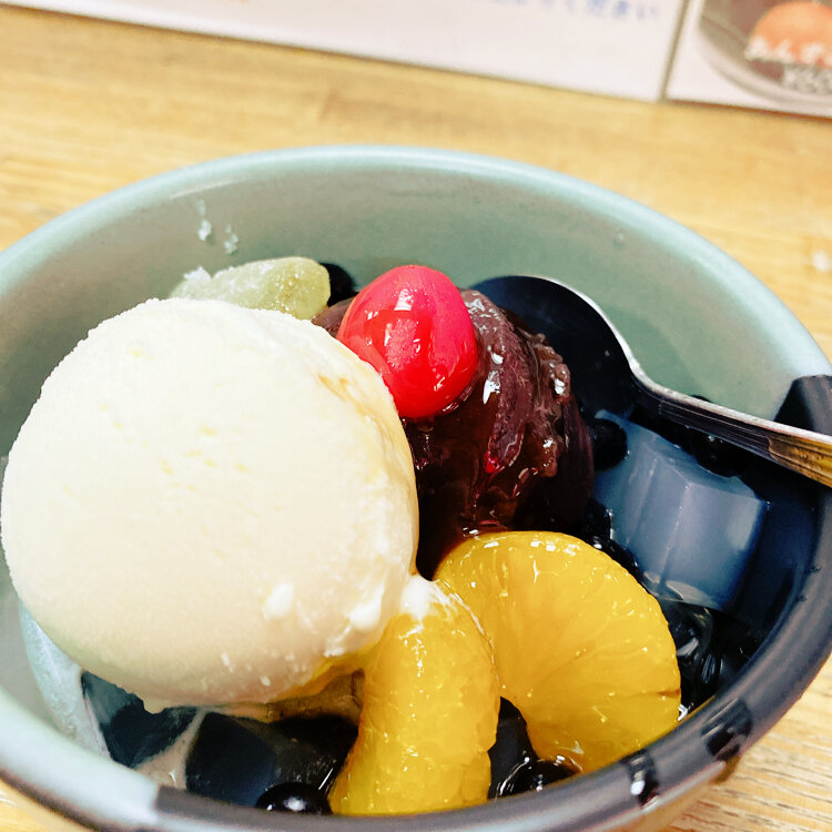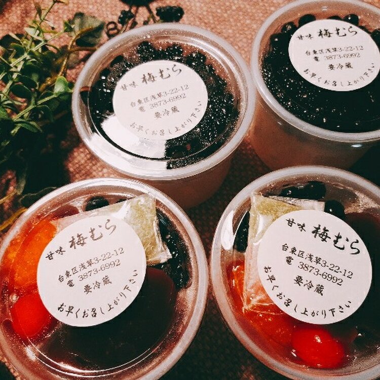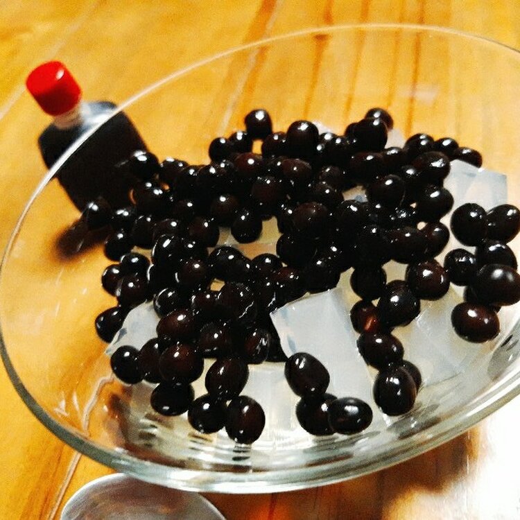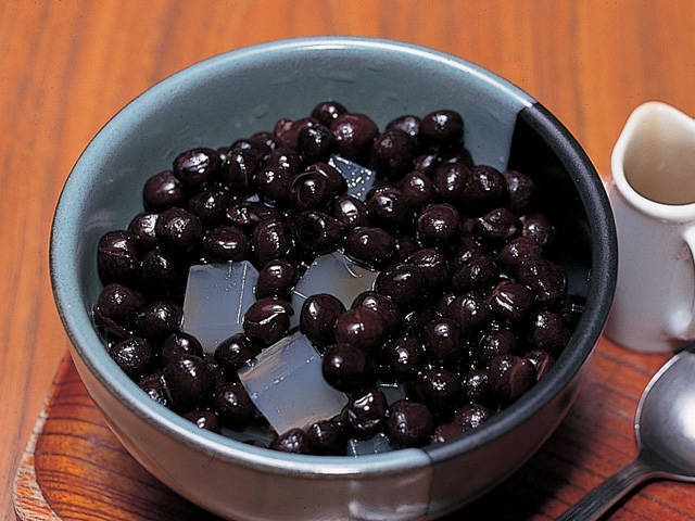 ふっくらとして美しいえんどう豆は北海道産を使用。その豊かな風味がプリッとした寒天と相性抜群だ。ちなみに寒天は伊豆諸島のテングサで作る。自家製黒みつをかけてどうぞ。