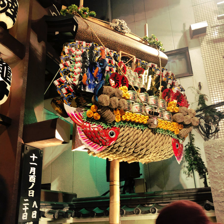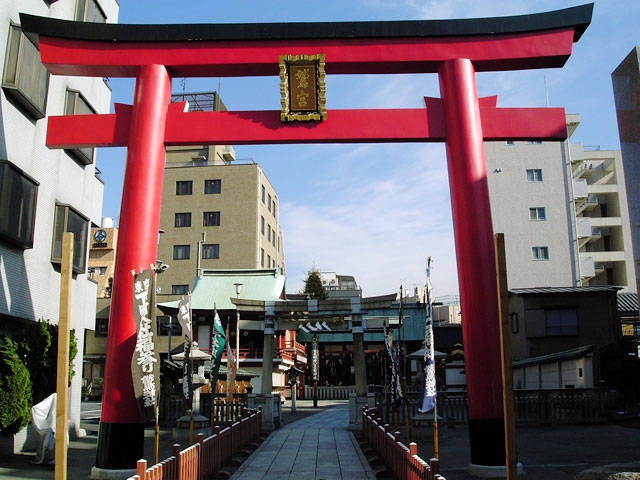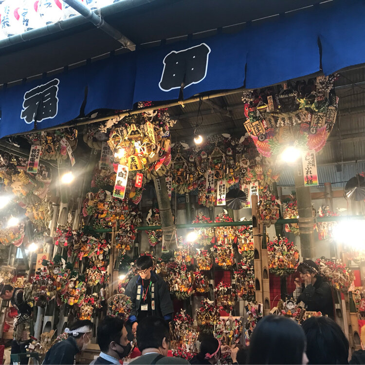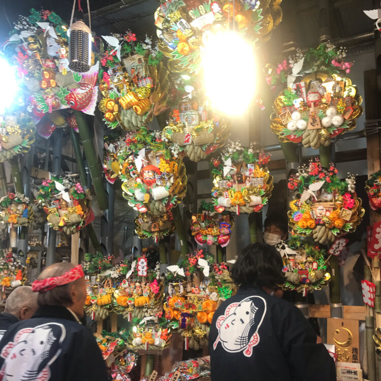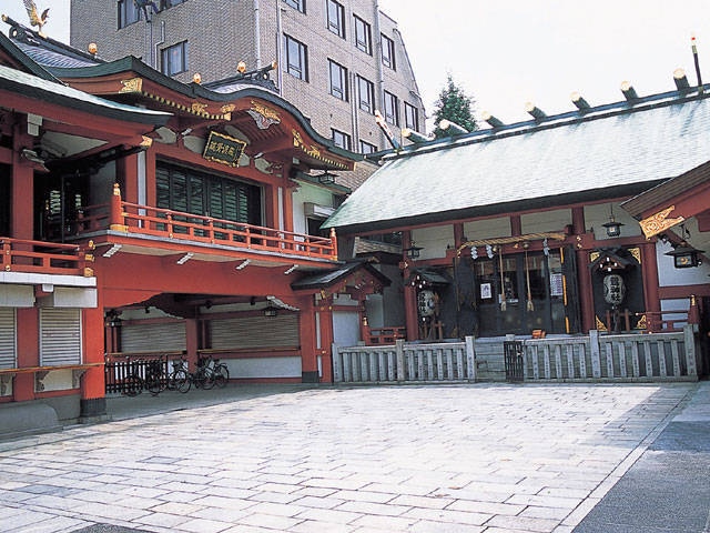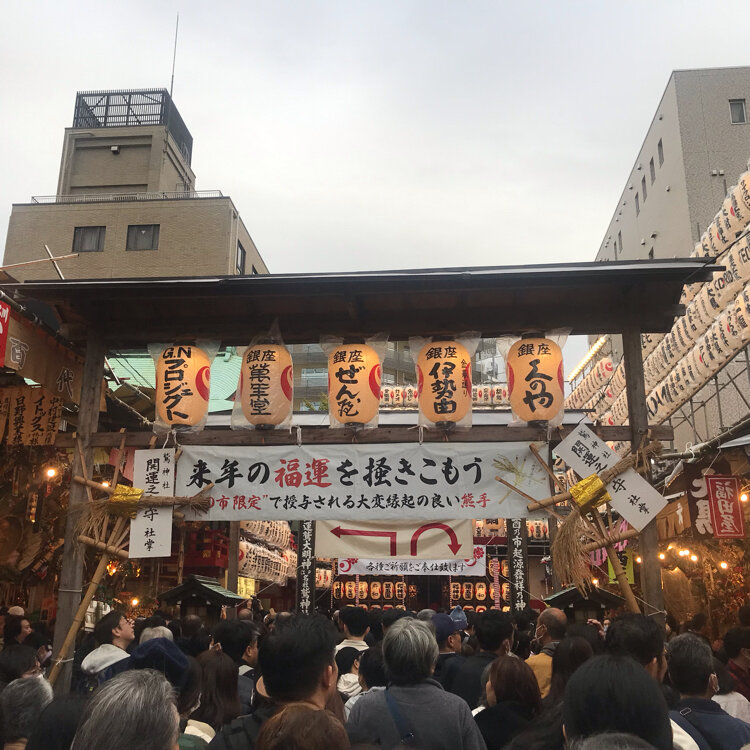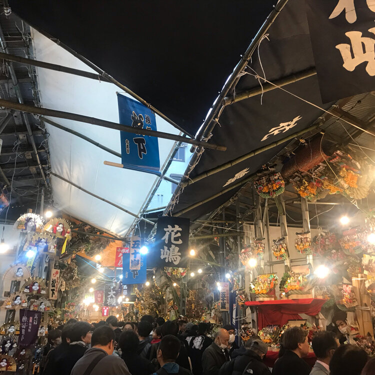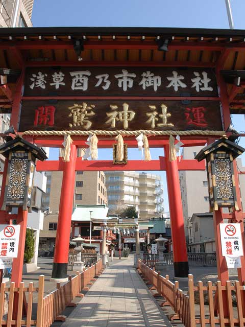 毎年11月に酉の市が行なわれることで有名な神社。当日は境内に所狭しと並ぶ屋台と、縁起物の熊手を求める人々で賑わう。熊手は開運、商売繁昌のお守りとされるものだ。