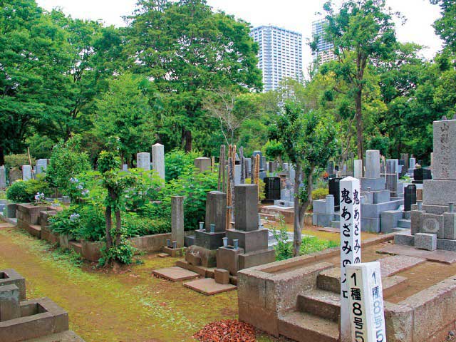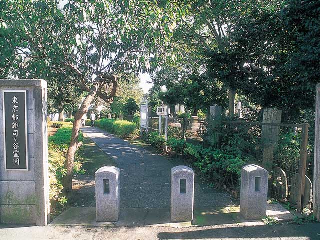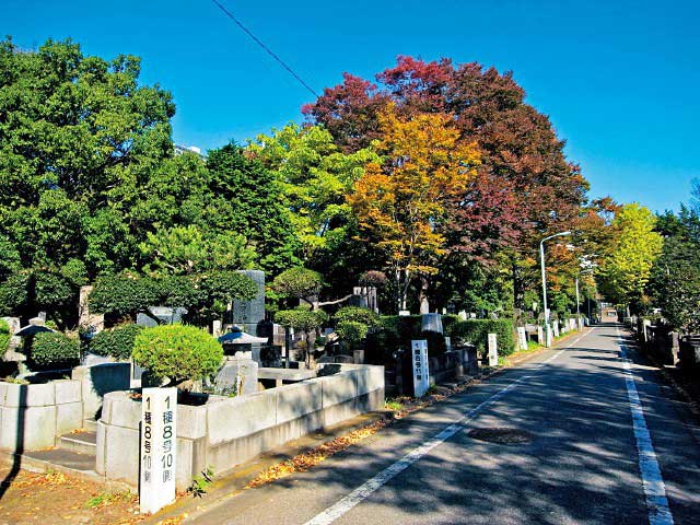 約11万平方メートルの広さをもつ都立霊園。敷地内には夏目漱石や永井荷風、泉鏡花、竹久夢二、小泉八雲、ジョン万次郎などといった名だたる著名人の墓が並ぶ。