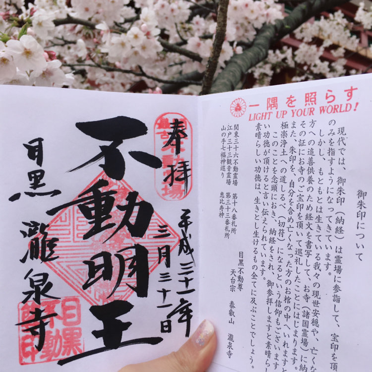【目黒不動尊(瀧泉寺)】 目黒に行ったら ぜひ立ち寄りたいパワースポットです✨🌟✨ リーベルさんでフルーツパフェを食べた後に寄りました〜⏮⏮⏮ はい、いつの続きか分からない続きです🤣 * ①②銅造 大日如来坐像(1683年鋳造) 大日如来さまは宇宙の中心であり 宇宙の真理そのものの存在🪐 𓂃𓈒 ✩.* 穏やかで端正な美しいお姿にこころ打たれました。 豪華な宝冠や装飾品を身につけて 光背は黄金に輝いています✨ 大本堂の裏手にいらっしゃいます♡ ことりっぷの小冊子にも載っていましたよ。 どのアングルから見ても凛とした美しさ😍 1枚目の写真はアプリでAIブレンドしてみました😊 とても大きな仏像で座高は281.5cmです ③山門の左手には桜の木🌸 今頃は散り始めて花吹雪でしょうか𓂃🌸𓈒𓏸 こちらは桜の名所としても有名です 急な石段を上ると 寺院なのに「山王鳥居」 神仏融合の特徴です お参りは「合掌一礼」ですよ😉 ④ご本尊は不動明王 御朱印も不動明王をいただきました🖌 御朱印帳を持参しましたが 書き置きのみ😌 ⑤ことりっぷの小冊子 「東急線さんぽ」に掲載されていました 奥付を見たら2016年発行 どこで手に入れたか忘れましたが 渋谷駅だったのかな〜🙄 * 瀧泉寺さんは天台宗の寺院で 創建は平安時代 都心にありながら緑豊かで広々して 清々しい気に包まれています🌳🍃 多くの仏像があり見所もいっぱいなのですが 私が1番の見所だと思う 大本堂裏手に鎮座する大日如来坐像さまをご紹介させていただきました。 * 目黒のお不動さまにお参りしてみませんか JR目黒駅から徒歩20分 目黒線 不動前駅から 徒歩12分です * #ことりっぷ東京 #目黒 #目黒不動尊 #瀧泉寺 #大日如来坐像 #目黒のお不動さま #お参り #お写ルン歩 #カメラ #fumitubu #ふみつぶぬ #キュンパス1day東京♥️