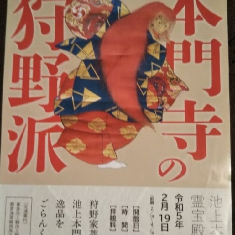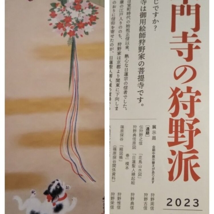 🙏池上本門寺🙏 ① どこかのミュージアムで2.3枚目の写真のチラシをもらった。そういえば池上本門寺って行ったことがないよね…… 日蓮がここで亡くなったんだよね…… 日蓮宗大本山 では行ってみましょうか\(^o^)/ 『本門寺の狩野派』(5/28まで) 池上本門寺 霊宝殿 〈開館日〉土、日、祝日 10時~16時 拝観料は300円ですか‼️ 桃山時代は京都で活躍していた狩野家ですが、徳川家康の江戸入りののち、江戸に下向する狩野家がありました。 江戸幕府 御用絵師 狩野家の菩提寺になったのが池上本門寺でした。 そうだよね🤫 将軍の絵の先生は狩野家の絵師だよ。 今までに3代 家光、4代 家綱、5代 綱吉の絵を見たことがある‼️ 今回は8代 吉宗の絵が見られます。 『竹に虎図』 ウヒョヒョ(*^¬^*) 上手いんだけど虎🐯に目が四つあるように見えちゃう。 3枚目の写真……チラシから撮った『薬玉に猫図』 薬玉🎊にじゃれている猫🐈️かわいいよね😆 色も美しい💖 他にも猫(=゚ω゚=)いたのよ。〈ネズミよけ〉になりそうな猫の親子の『猫図』 狩野派って桃山時代の狩野永徳を思い出す😃💡 すごく⤴️⤴️大胆で勇壮な画風を思い浮かべるけど、江戸の狩野派はわりと可愛い絵も描いているんだね😉 色も明るく美しい💖 それにここは菩提寺でしょ。墓を改修するときに遺骨から複顔したものも展示されているの。御用絵師って感じの顔だね〰️😸 展示会場は狭いのだけど面白かった(^-^)v 1枚目の写真……『大堂』大きいね〰️ 写真に収まりきれない‼️ 〈西馬込〉駅から歩いて来たので裏から境内に入りました。大堂の屋根がそびえ立つように目に入った😆 オオー☀️着いた、着いた❗️ 4枚目の写真……江戸幕府 2代将軍 秀忠の乳母が発願して、秀忠が寄進建立した関東に残る最古の五重塔。 ソメイヨシノの満開🌸の時はさぞかし美しいだろうね。名残の桜🌸に五重塔です。 5枚目の写真……季節はどんどん進む⏩️ もう藤の花がこんなに咲いていました。 お寺の塀越しの藤の花 今年は春が駆け足で行くね🏃💨 雲ひとつない快晴☀️ 散策日よりでした。 #私のことりっぷ旅 #池上 #池上本門寺 #狩野派 #江戸幕府 #御用絵師 #五重塔 #日蓮宗 #大本山 #花だより #Myことりっぷ