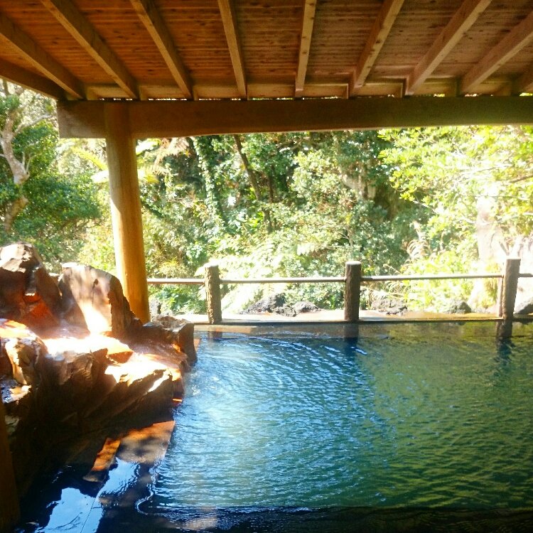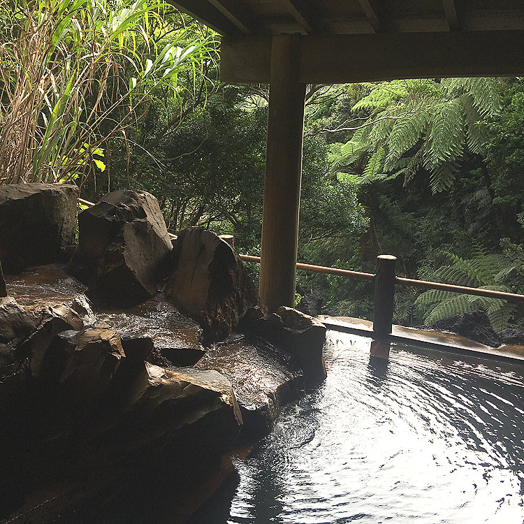 屋根つきの露天風呂は混浴のため、水着で入浴する。名滝・裏見ヶ滝の水音や木々の緑など、野趣に富んだ渓谷の温泉ならではの風情も楽しめる。ナトリウム塩化物強塩温泉。
