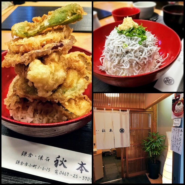 久々の鎌倉はじゃじゃ降りでした‪‪☔️💦‬ ④ ラスト 鎌倉小町通り 秋本 長谷から江ノ電乗って、鎌倉駅へ🚋💨 雨はこの時点でピーク‪‪💦‬もう雨の中ウロウロするのも限界で( ; ›ω‹ )、ランチは、Googleマップで近くのしらす丼のお店をググって出てきた、小町通りの『秋本』さんへ‪‪💦‬ そしたら、このお店だけ混んでました! 廊下で数組待ち! おぉ、これは期待大か… (ↀДↀ)✧ しらす丼目当てだったのですが、メニューみて、鎌倉野菜の天丼に目を奪われてしまい…(*♥д♥*) 連れと半分ずつにしようと、しらす丼と天丼をオーダー。 結果、大当たり✨️でした~✨️✨ 結構待って、やってきたふたつのそびえ立つタワー丼…! (笑) すっごいテンション上がります⤴︎⤴︎ しらす丼のしらすも大粒で、鎌倉野菜天丼も何の野菜かが食べても分からなかったですが、甘くて瑞々しくて、でもサクサクで♡ 美味♡でした✨️✨ 天丼に付いていたデザートのゆずシャーベットも、美味♡でした✨️✨ 色々思い通りにいきませんでしたけど(笑)、行き当たりばったりのお昼が当たりで良かったです~ヽ(●´∀`●)ノ #鎌倉 #小町通り #和食 #ランチ #しらす丼 #鎌倉野菜 #天丼 #大雨 #ことりっぷ神奈川 #秋