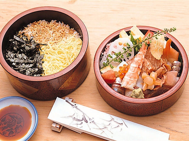 鎌倉文学館入口にほど近い寿司店。相模湾と築地の新鮮なネタを使った寿司が評判だ。約20種類のネタを使った2段重ねの特上ちらしは、ボリュームたっぷりで人気。