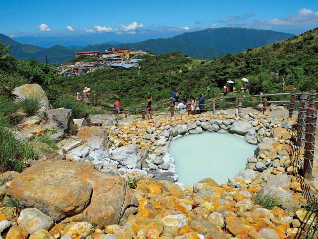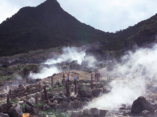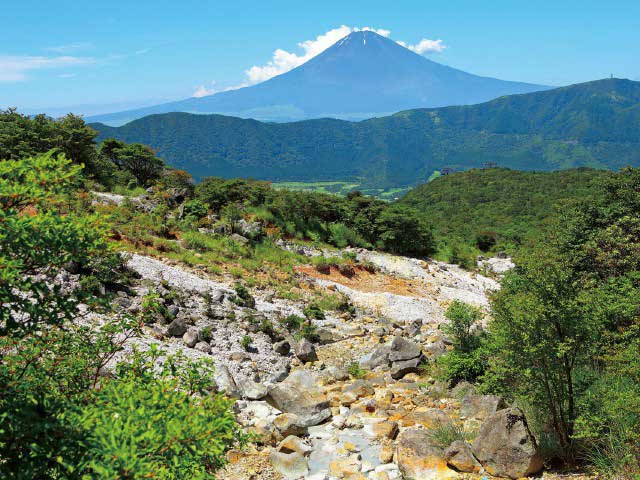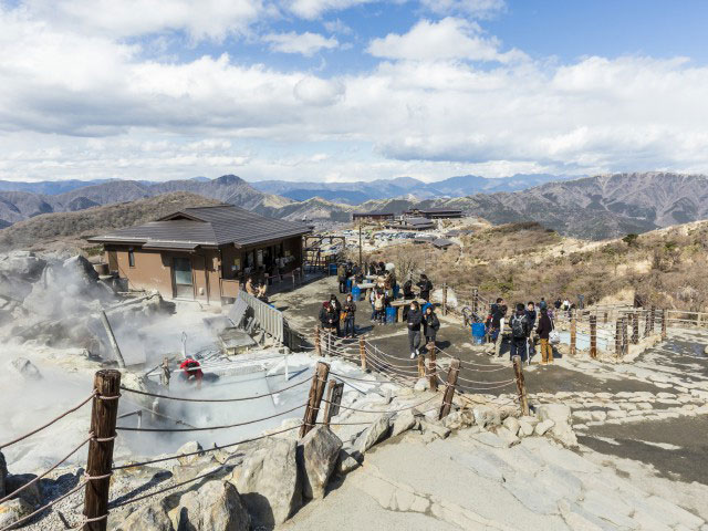 大涌谷駐車場から噴煙が勢いよく上がる噴煙地に行き、起点に戻る1周670mの遊歩道。往復するだけなら約30分ほどだが、寄り道をしながらゆっくりと巡りたい。