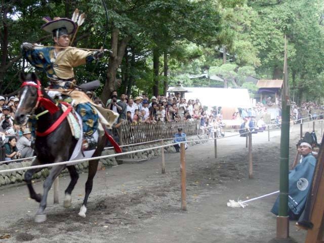 「鶴岡八幡宮の例大祭」では、「浜降式」や、「例大祭」の後、神輿3基による「神幸祭」などが行われる。流鏑馬神事では馬上から3つの的を次々と射抜く様子は必見。