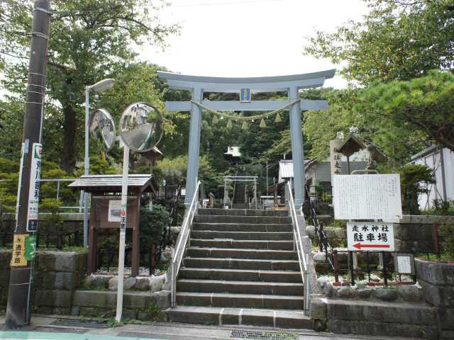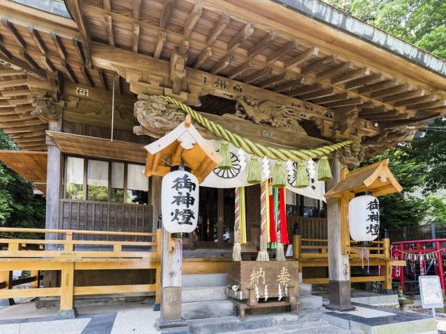 鬱蒼とした木々の中に立つ神社で、祭神は日本武尊とその妃の弟橘媛命。境内には弟橘媛命の歌碑、舵の碑、包丁塚などがある。