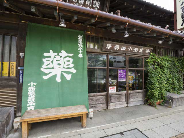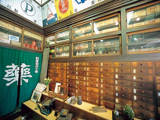 寛永10(1633)年創業。国の登録有形文化財の薬局が、所蔵品を公開するミニ博物館。歴史を感じる百味箪笥、乳鉢や秤など、薬関係の貴重な骨董品が展示されている。