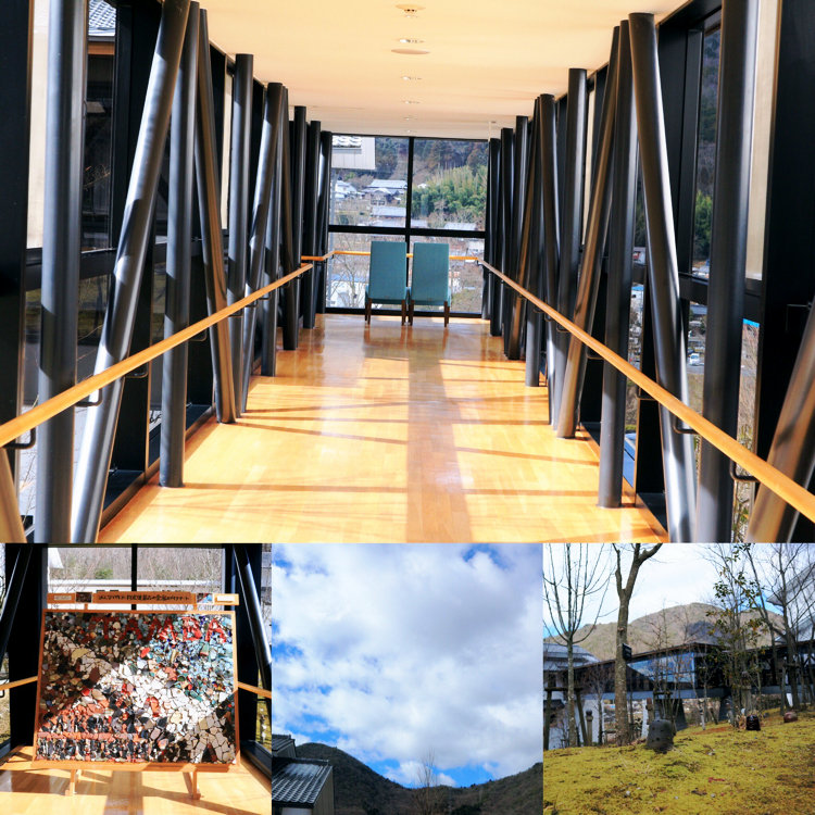 中庭にはかがり火の演出、廊下は畳敷き、ロビーで無料のコーヒー、サウナと水風呂あり。