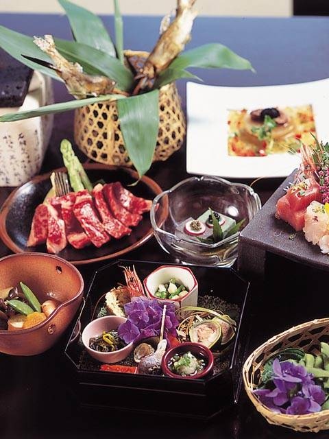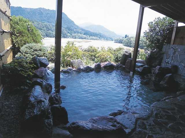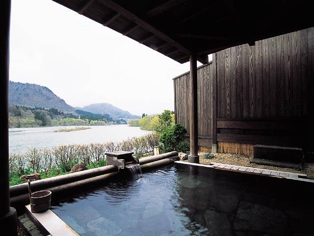 阿賀野川の流れを望む客室や露天風呂はまるで絵画のよう。河原での水遊びや、麒麟山の散策を楽しみたい。料理は山菜やアユがメイン。露天風呂付客室も好評だ。