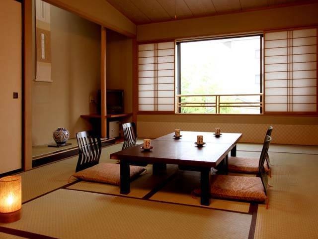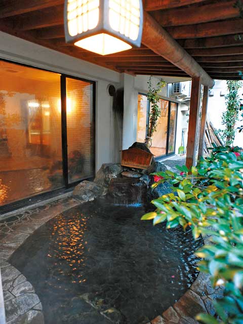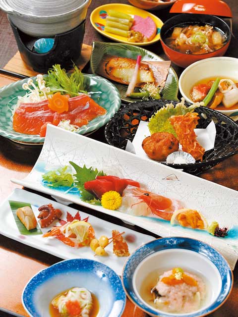 歌舞伎をモチーフとした装飾の館内には清涼感がただよう。庭園露天風呂「龍神の湯」、内風呂はともに趣深い。料理は旬の素材を生かし、冬期はズワイガニ料理も味わえる。