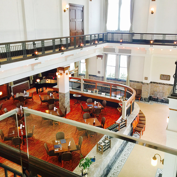移築された昭和初期の貴重な銀行の建物。ワイナリー直営のレストラン。信濃川を眺めながら自家製ワインが楽しめる。