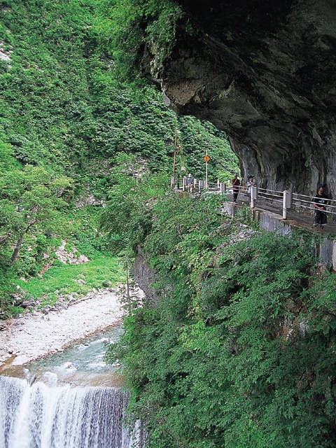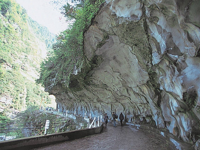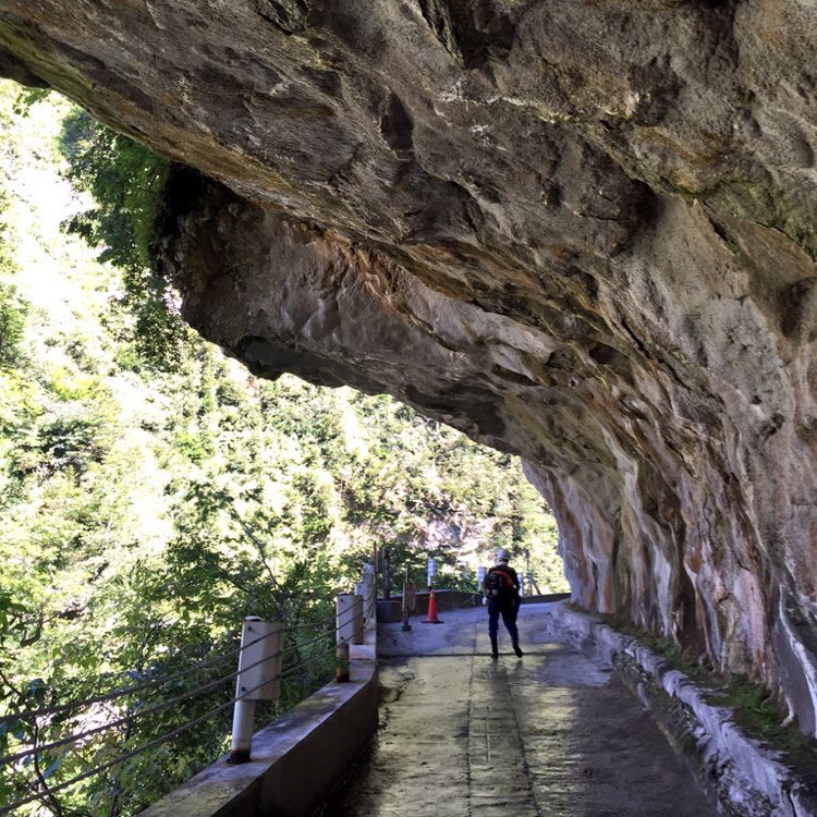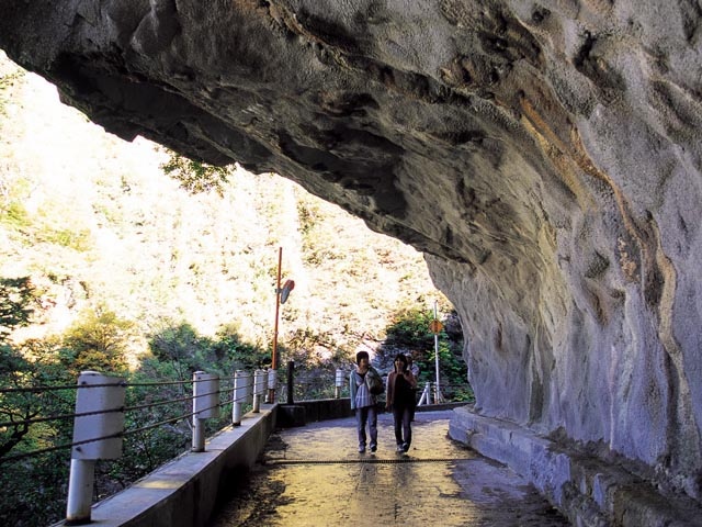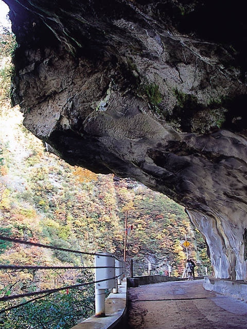 道を造るため岩を削った際にできたもの。頭上を覆う岩は、下を通る人をのみ込まんばかりの迫力。一方の深いV字谷へ落ちる急峻な断崖と相まって怖さが募る。