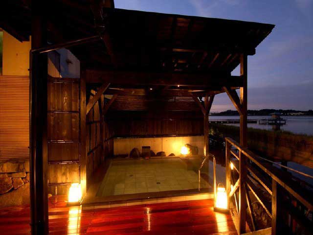 創業当時から永平寺指定の宿となっている由緒ある宿。いちばん湖に近い部屋は、温泉岩風呂付きの特別室でとても優雅な造り。趣向を凝らした料理にあう厳選芋焼酎と地酒が好評だ。