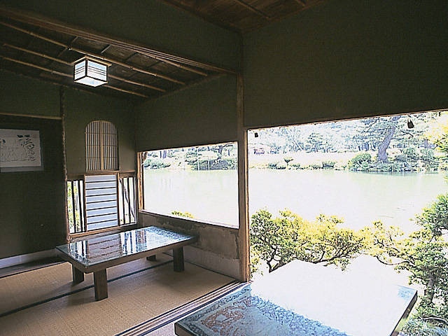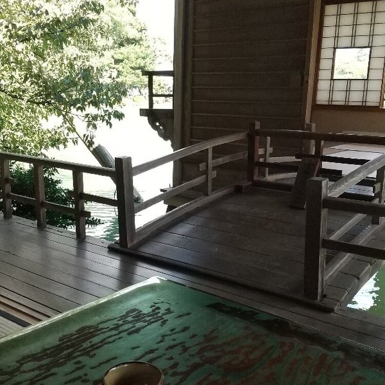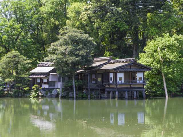 霞ヶ池のほとりにたたずむ茶店。名物の「あんころ餅」をはじめ、丼物やそばなどの食事メニューもあり、池に浮かぶ蓬莱島などの景観を眺めながらいただける。