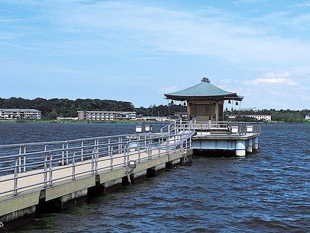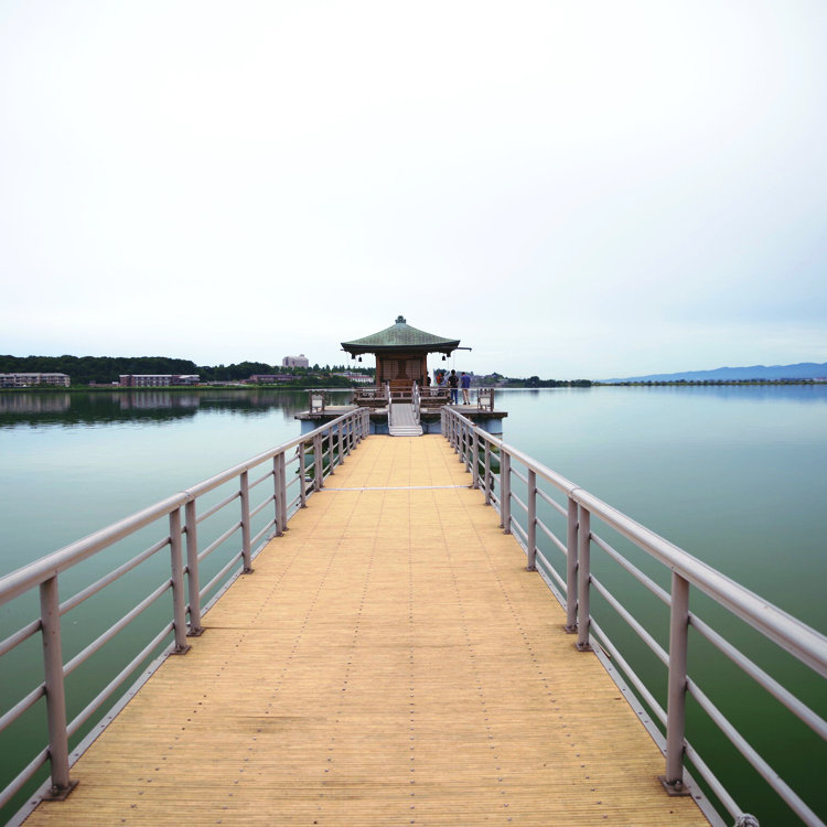 開湯伝説にちなむ弁財天と竜神を祀っている浮御堂。桟橋で湯の元公園とつながっている。夜は明かりが灯り、幻想的な雰囲気に包まれる。柴山潟中央にある噴水との競演も見もの。