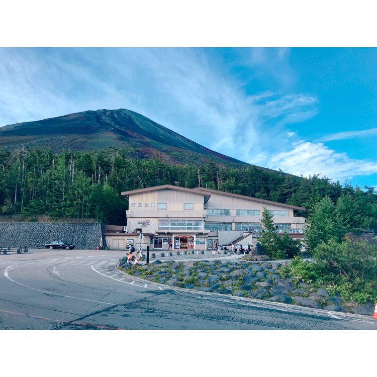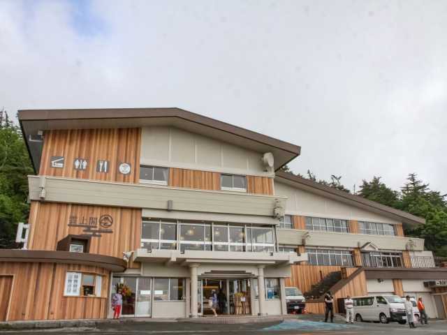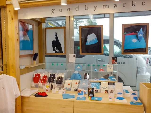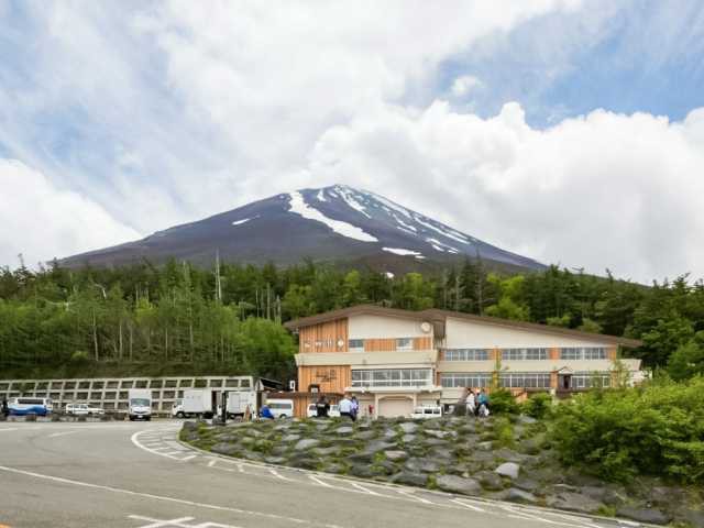 富士山五合目にある明るくモダンな雰囲気のドライブイン。売店にはおしゃれな富士山グッズや、オリジナルのおみやげ品などが多数並ぶ。