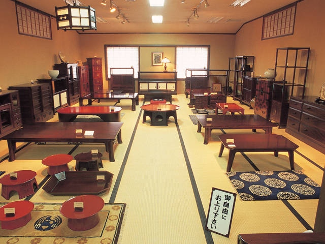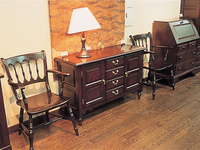 味わい深い色合いと重厚感が魅力の松本民芸家具。量産家具に比べて値段は張るが、丈夫で使い込むほどに味わいが増す。家具は受注生産、小物はその場で購入可能。