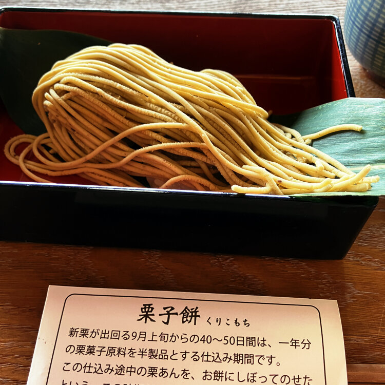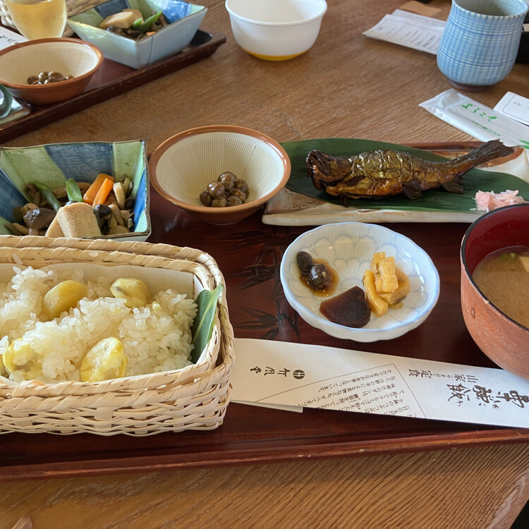 小布施を代表する栗菓子店で、菓子や栗おこわを販売する。また、昭和47(1972)年からの定番メニュー「栗おこわ山家定食」をはじめ、創製名物「栗あんしるこ」や「栗あんみつ」などが味わえる。