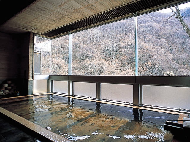 250年の歴史を誇る老舗旅館。一番の目玉は、松川渓谷にせり出すように造られた「仙人露天岩風呂」。四季折々の変化をみせる渓谷美を館内からも観賞することができる。