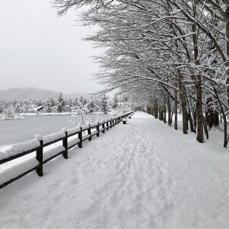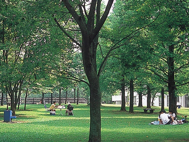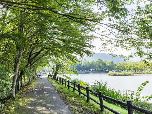 クリスマス時期のイルミネーションなど、年間を通してさまざまなイベントが行われている広大な公園。園内中央には池があり、晴れた日には浅間山と離山が同時に眺められる。