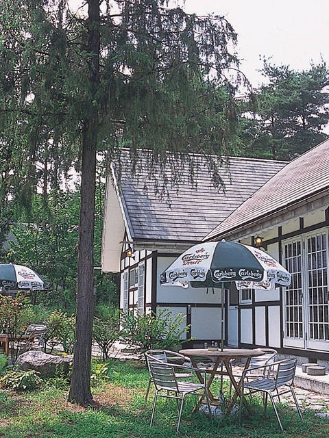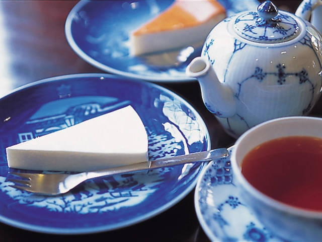 大熊美術館併設の雑木林に囲まれた喫茶室。デンマーク産クリームチーズを使用した自家製チーズケーキはレアとベイクトの2種類。