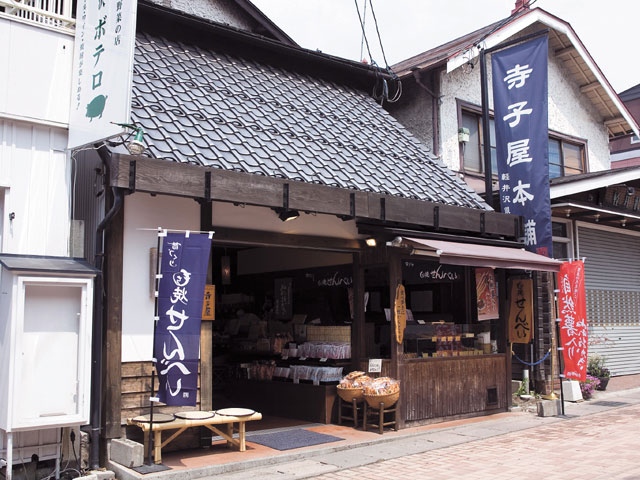 手造りおかきの専門店。店頭ではメニュー豊富な串ぬれおかきと、サクッとした歯ざわりで香ばしいもち焼せんべいを販売中。店内には多数の品があり、お土産にもお勧めだ。