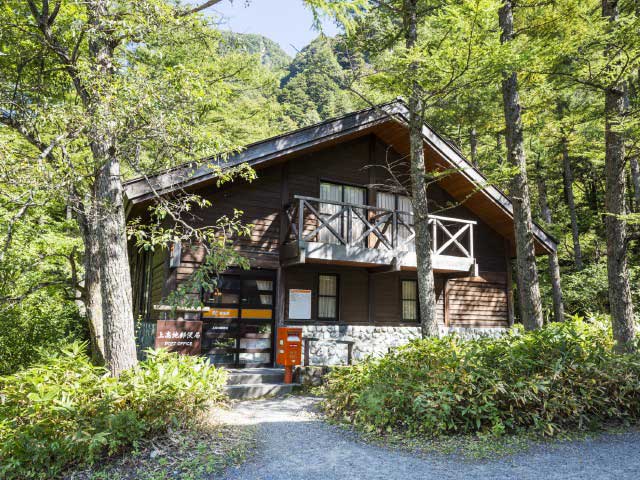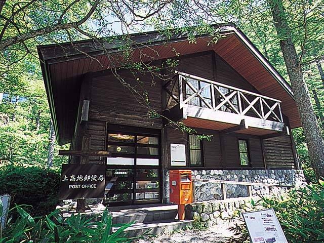 河童橋から近い場所に立ち、郵便業務のみ行う郵便局(ATMは無し)。山小屋風のたたずまいは周囲の自然環境を考慮した造り。上高地の風景の記念日付印の押印サービスも行っている。
