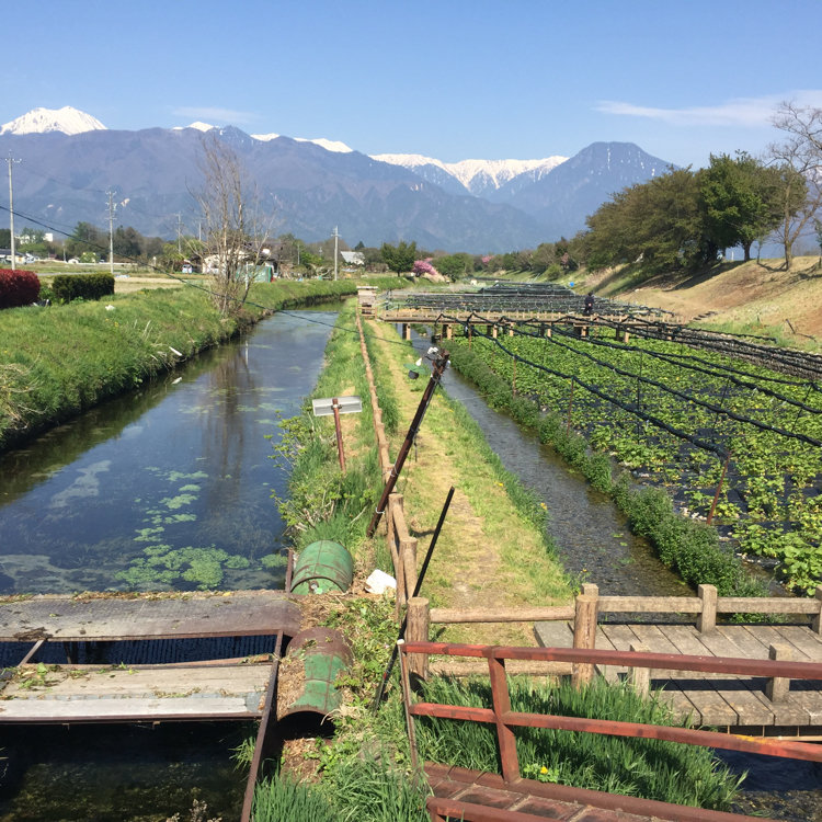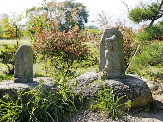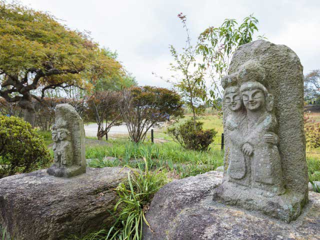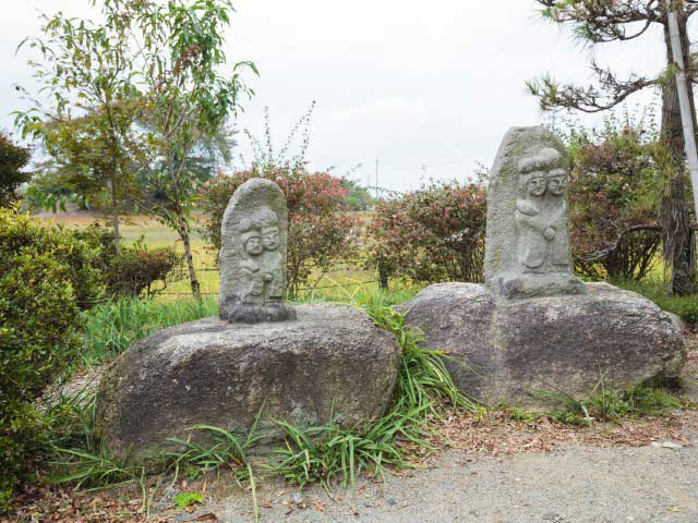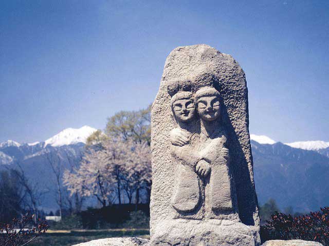 昭和50(1975)年の連続テレビ小説『水色の時』に使われた道祖神。北アルプスの山々を背景に記念撮影スポットとしても人気。