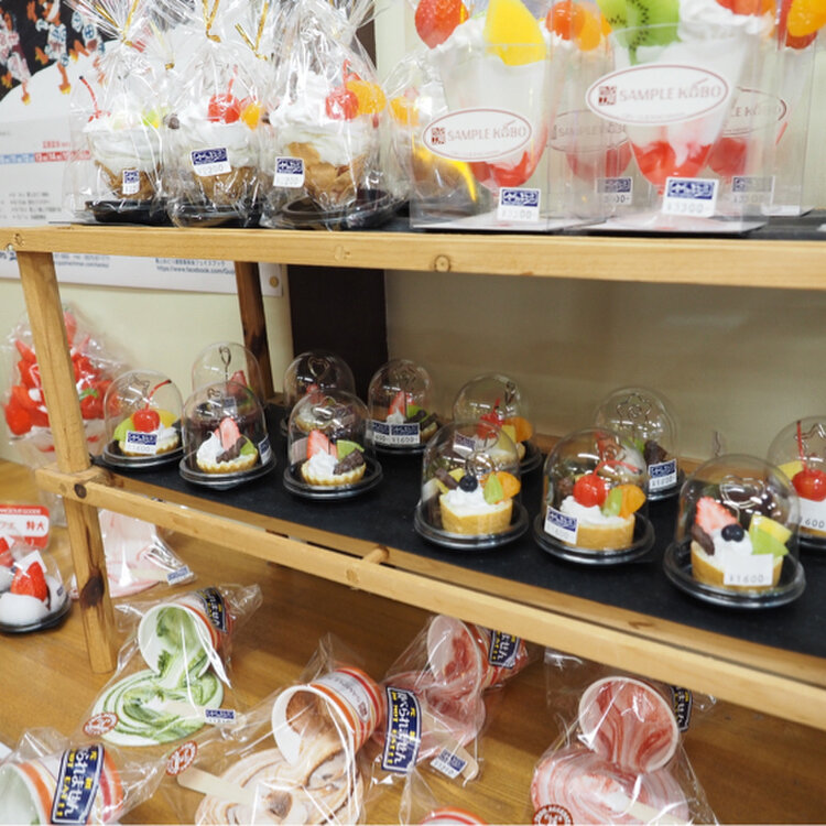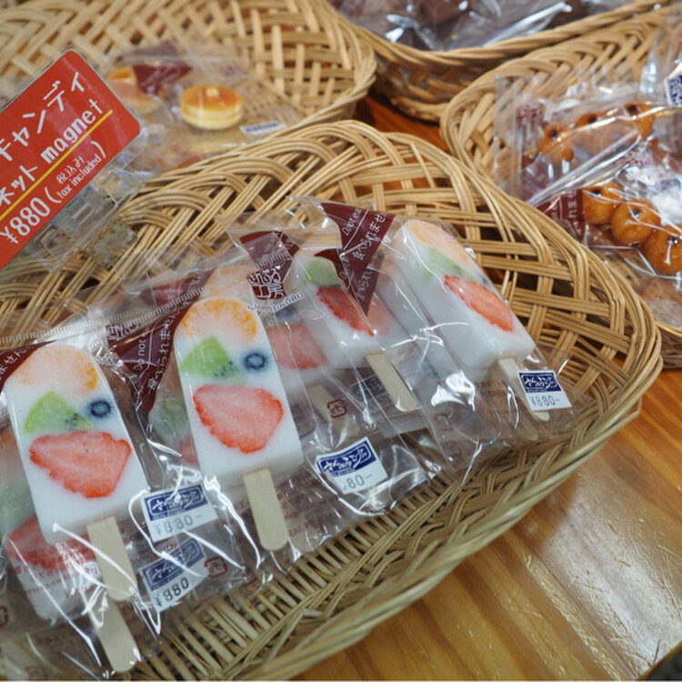 食品サンプルの技術やその魅力を体感できる観光施設。食品サンプルを使ったキーホルダーやマグネットなどのみやげのほか、本格的な業務用サンプルも販売する。