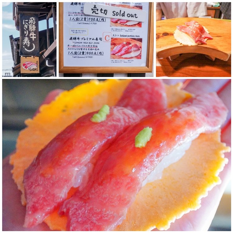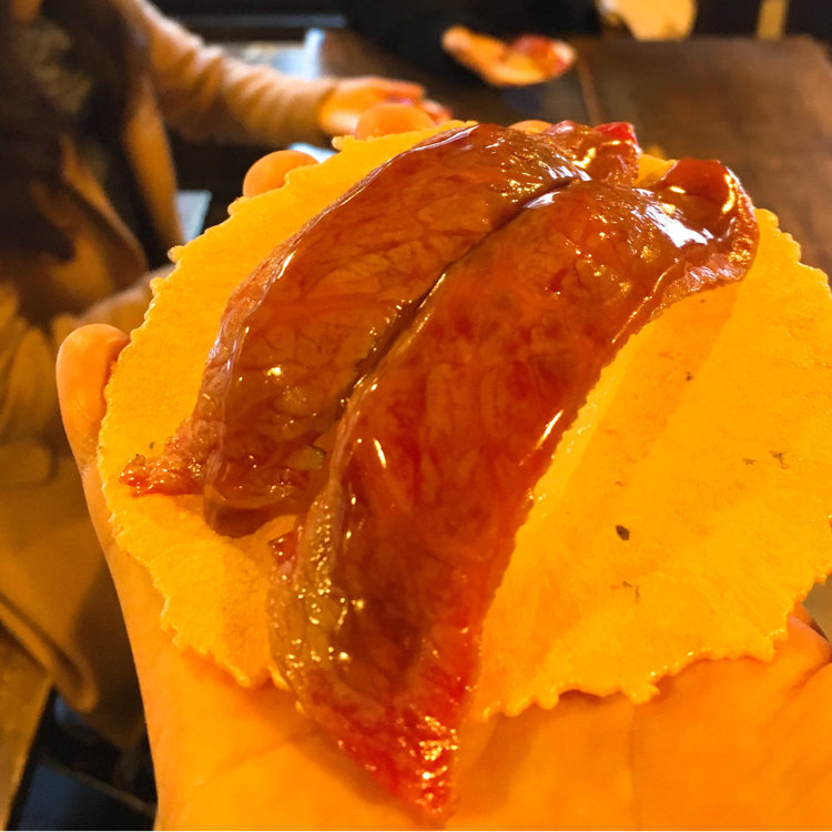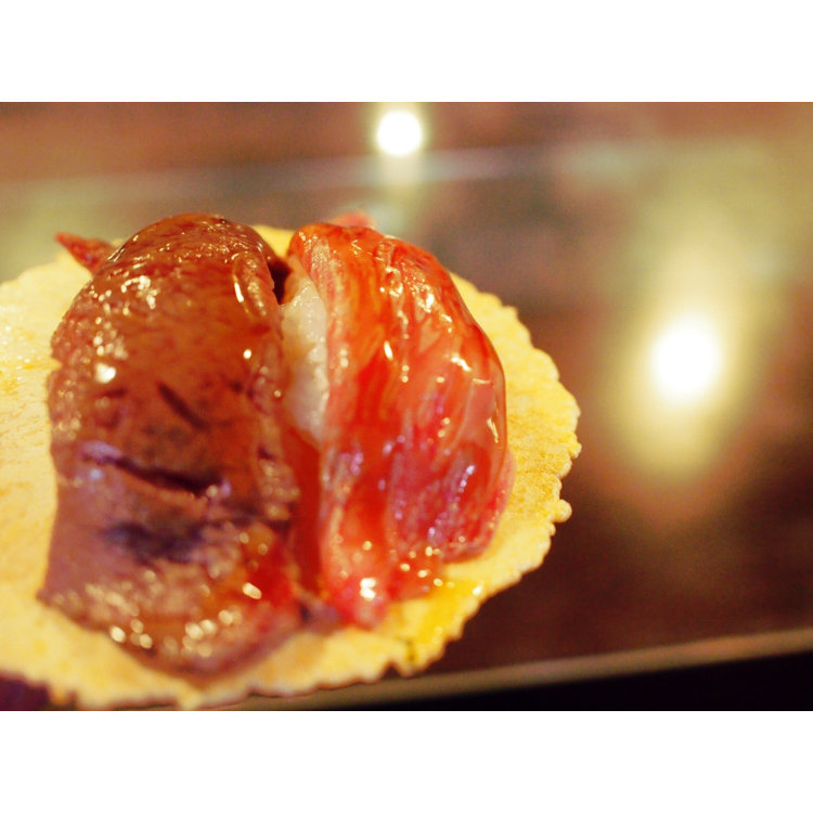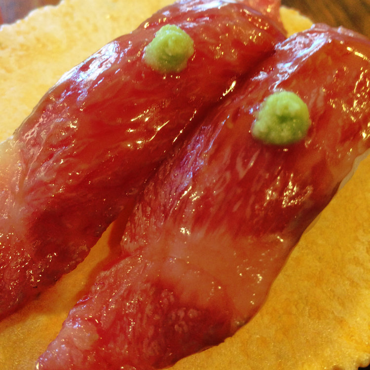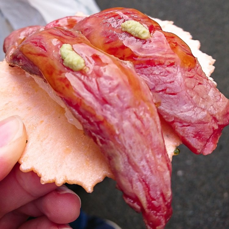 🍴岐阜県 高山市 坂口屋☀その2 飛騨総社のお祭りを見にぐるっと一周りしてきましたが、そんなにすぐにお腹は減りません😛 しかし、岐阜に来て自分がまず何を食べようとしたか覚えていますか?(下呂に寄ったくだりを覚えていたらユキタカ検定1級です) 「飛騨牛の握り」ですよ🍣✨ 先程、飛騨牛A5ランクのステーキを食べたのに…お腹が空いた訳でもないのに… しかし、ここは初心貫徹و 料理の味も良く、旅人にも親切で感じの良い坂口屋さんへと舞い戻るのですꉂꉂ😄 飛騨牛握りの発祥の店でもあり、行列ができていますが並びます。 A(赤身ぽい)、B(中トロ的)、C(大トロ様)のどれにしよう…やっぱりお腹の具合からBかなと決めたところ、B完売に⚡orz …AかCか?…AかCか!? 量が同じなら、美味い方に決まってるじゃないかー!!そもそも、コレを食べたかったんだろー!悔いを残すなって!と後ろで囁く脳内の声に…。 C「飛騨牛プレミアム寿司」一択デス💨笑 エビせんに乗った二貫のお寿司。 小ぶりなシャリに、大ぶりなネタ! 片手でカメラを出し…片手で近撮…画像確認…もう1枚…確認…もう1枚…。ハッ!ぼやぼやしてたらネタが乾く! 実食。。。( ‘ч’ ) 柔らかい!噛んでるうちに脂が溶けてくるようで、甘い。そして旨い! もう1つ、パク…もぐもぐもぐもぐ…あぁ、食べて良かった♡ 個人的にはワサビは倍くらいあると脂っぽさが消えるので好みですが、このキレイに脂の差したA5飛騨牛の握りは、目にも舌にも美味しい、土地ならでわのお寿司でした(*´罒`*)b (2018.05.05撮影) #岐阜#高山#坂口屋#ランチ#おやつ#飛騨牛#SONYa6000#GW弾丸ことりっぷ