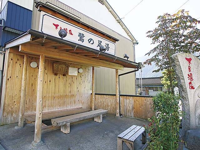 木造りの湯船とベンチの上に雨除けがある、和風の小さな足湯。鷺の足湯は、1000年ほど前に1羽の白鷺が温泉の湧く場所を村人に示したという白鷺伝説に由来する。