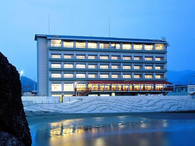 なまこ壁の町並みで知られる西伊豆の拠点、松崎にある温泉宿。最上階には大浴場と露天風呂があり、新鮮な料理も自慢。目の前が海水浴場で、夏は海水浴客で賑わう。
