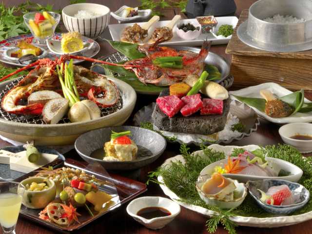 全室に海と伊豆七島を雄大に望む絶景の露天風呂付き。伊豆の三大味覚である、伊勢エビ、金目鯛、静岡産あしたか牛など、地の食材にこだわった創作料理も好評。温かなもてなしも自慢。