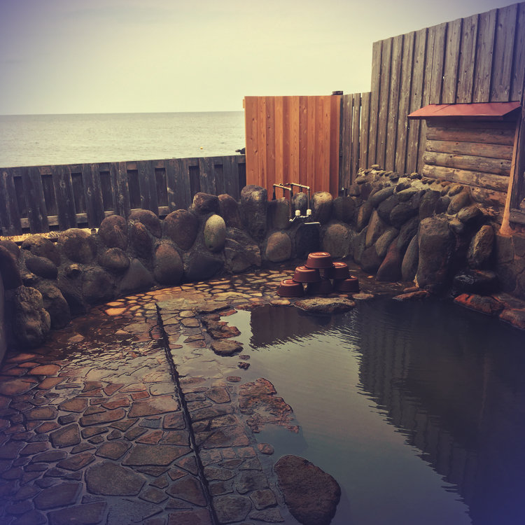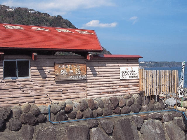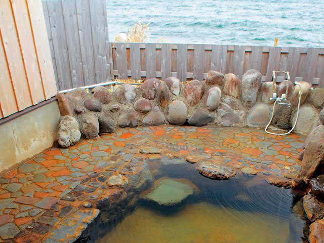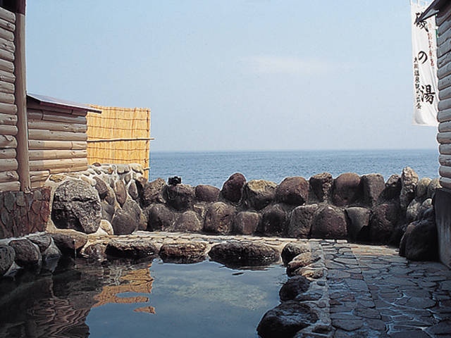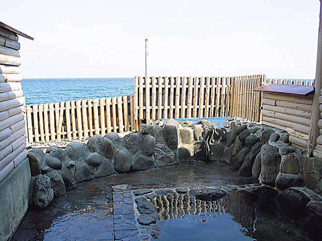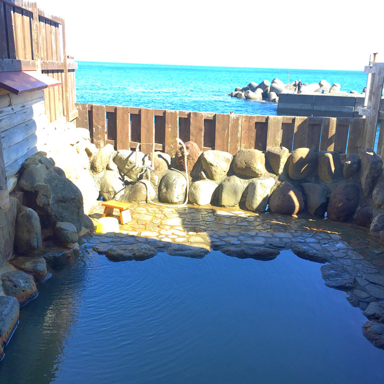 大川漁港近くの波打ち際にある公共の露天風呂。岩で組まれた男女別の浴槽には、よく温まるやわらかな湯が豊かに満ちる。潮騒が耳にやさしく届く湯あみは、ぜいたくなひととき。